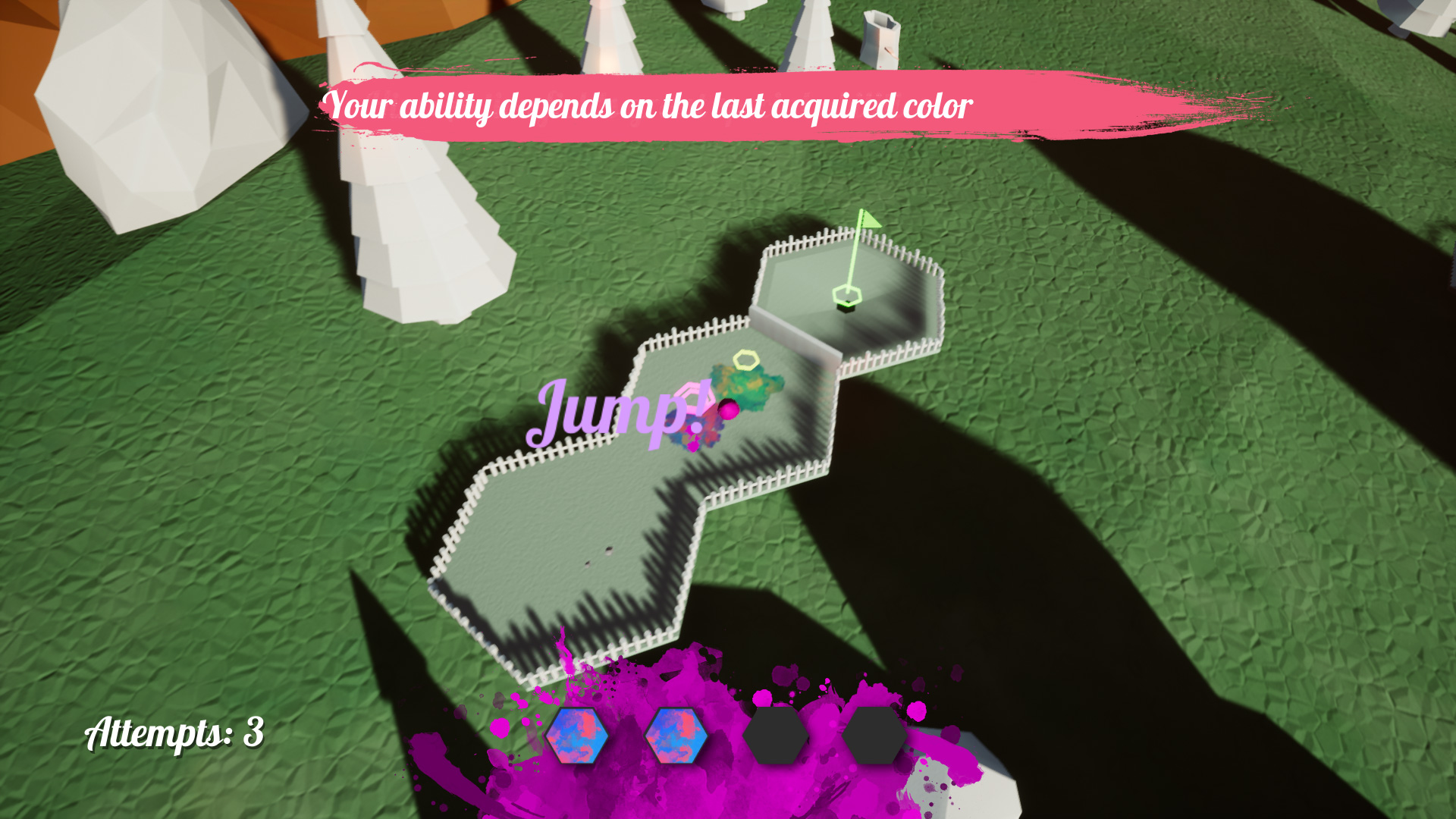 The in-game UI elements strikes the eye. Animated colourful splashes on the bottom indicate the special ability the ball has picked up. Additionally the ball is dyed in the colour of the ability and an animated call-to-action (“Jump!”) is displayed on top of the pad.